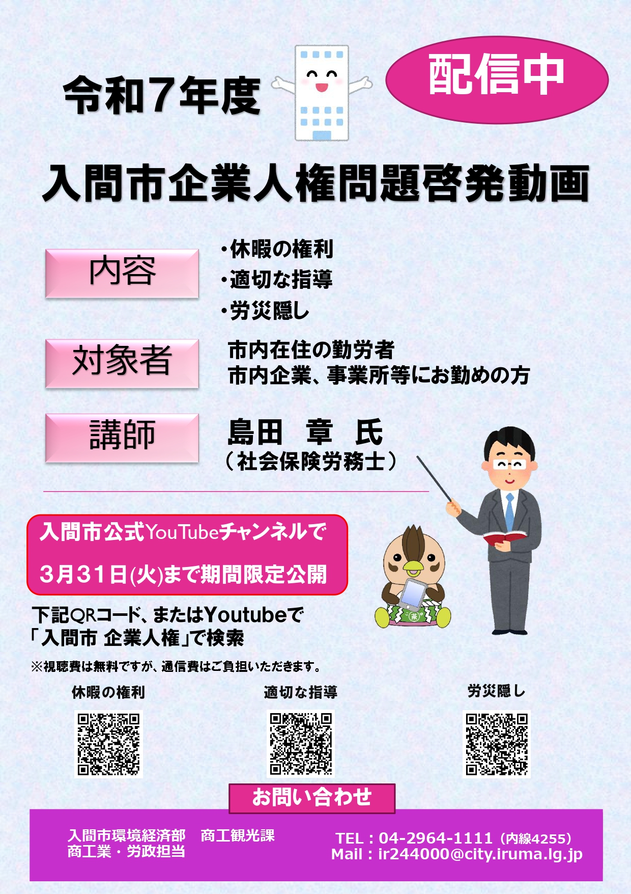 「入間市公式YouTubeチャンネル(外部リンク)」にて企業人権問題啓発動画が公開されております。短時間で人権問題への理解を深めていただける内容なので、企業における人権啓発の教材としてご活用ください。