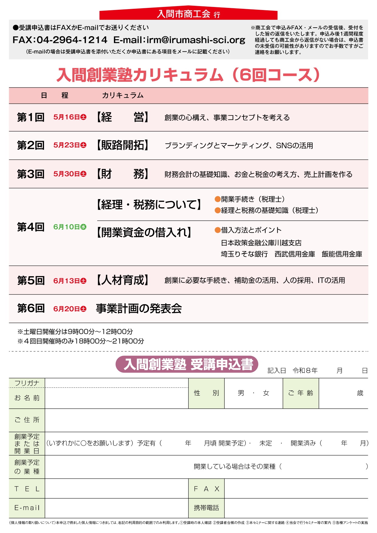 ○申し込み方法:下記受講申し込みフォームにご回答いただくか、添付の申込書に必要事項をご記入いただき、入間市商工会へFAX又はE-mailにてご送付ください。